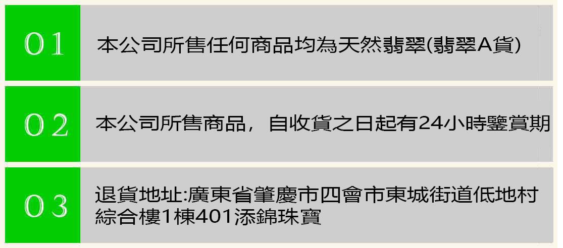 『温馨提示』您所购买的手镯支持24小时鉴赏期但宝贝破损影响二次销售和逾期退货均不接受任何理由退货,感谢您选择添锦珠宝!我们会永远将服务和售后放在首位,若收到宝贝有任何问题请您及时和我联系沟通,以便于下次能更好的服务您。如若喜欢也期待您的买家秀哟