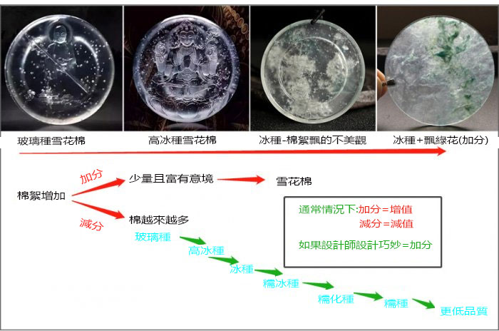 冰种:像冰箱里的冰块,微透带朦胧感,边缘通透,内部可能有少量棉絮;